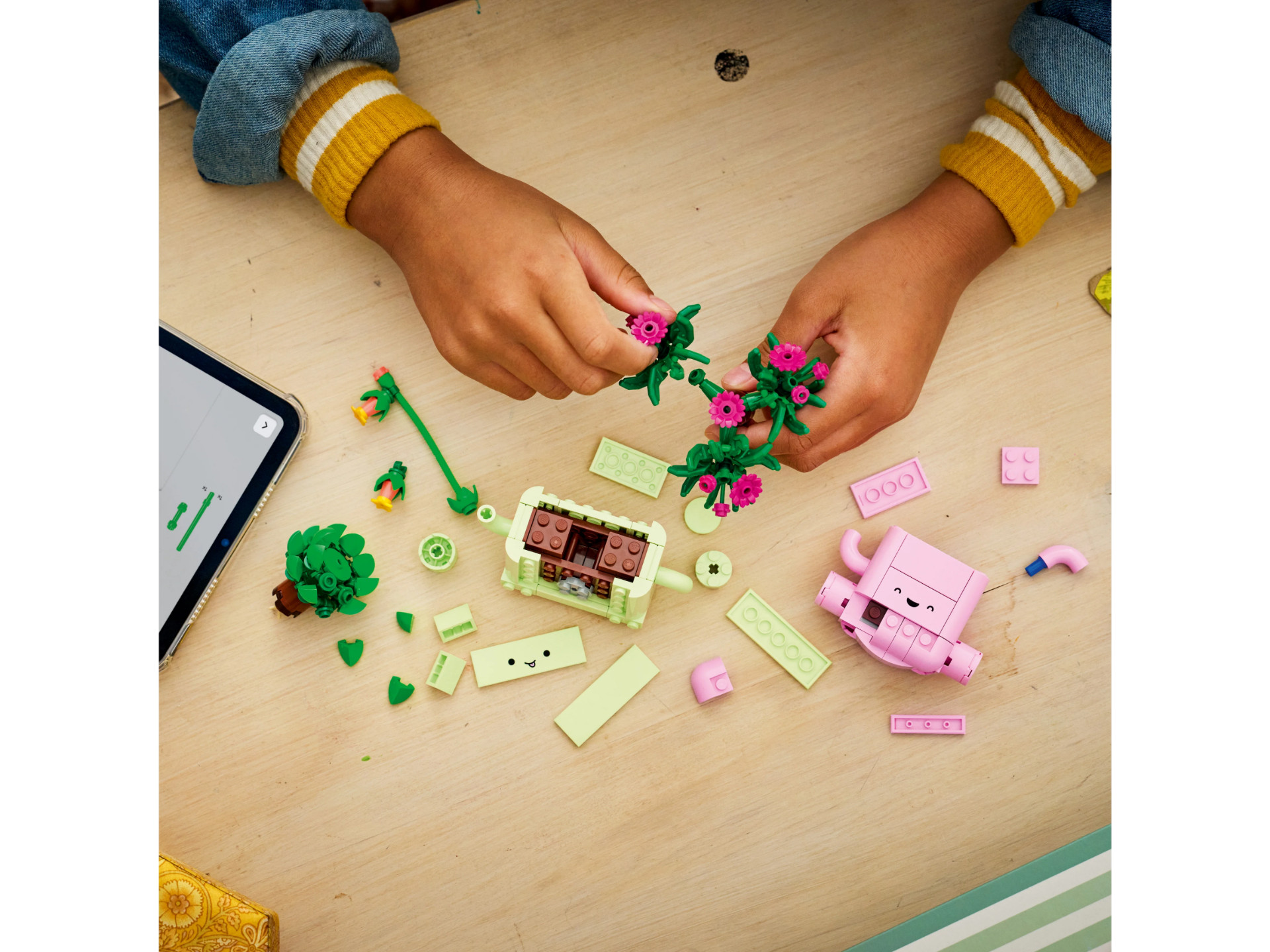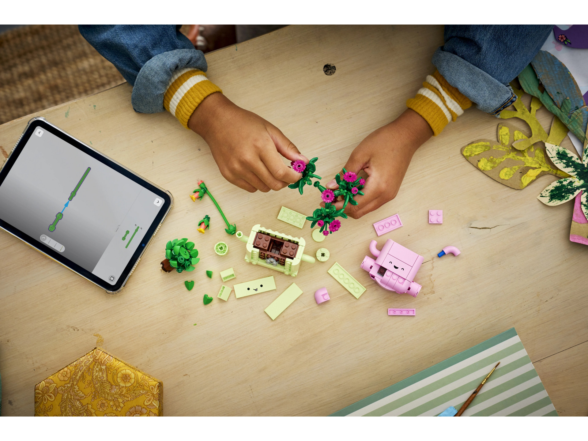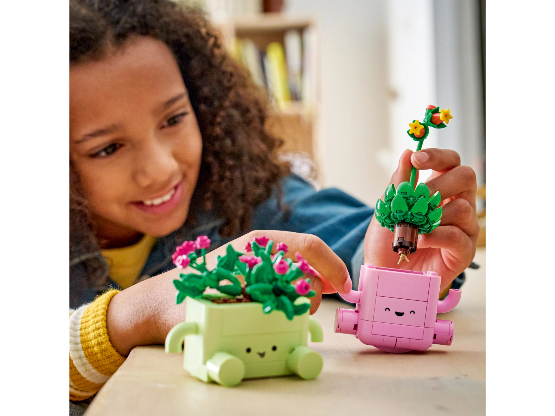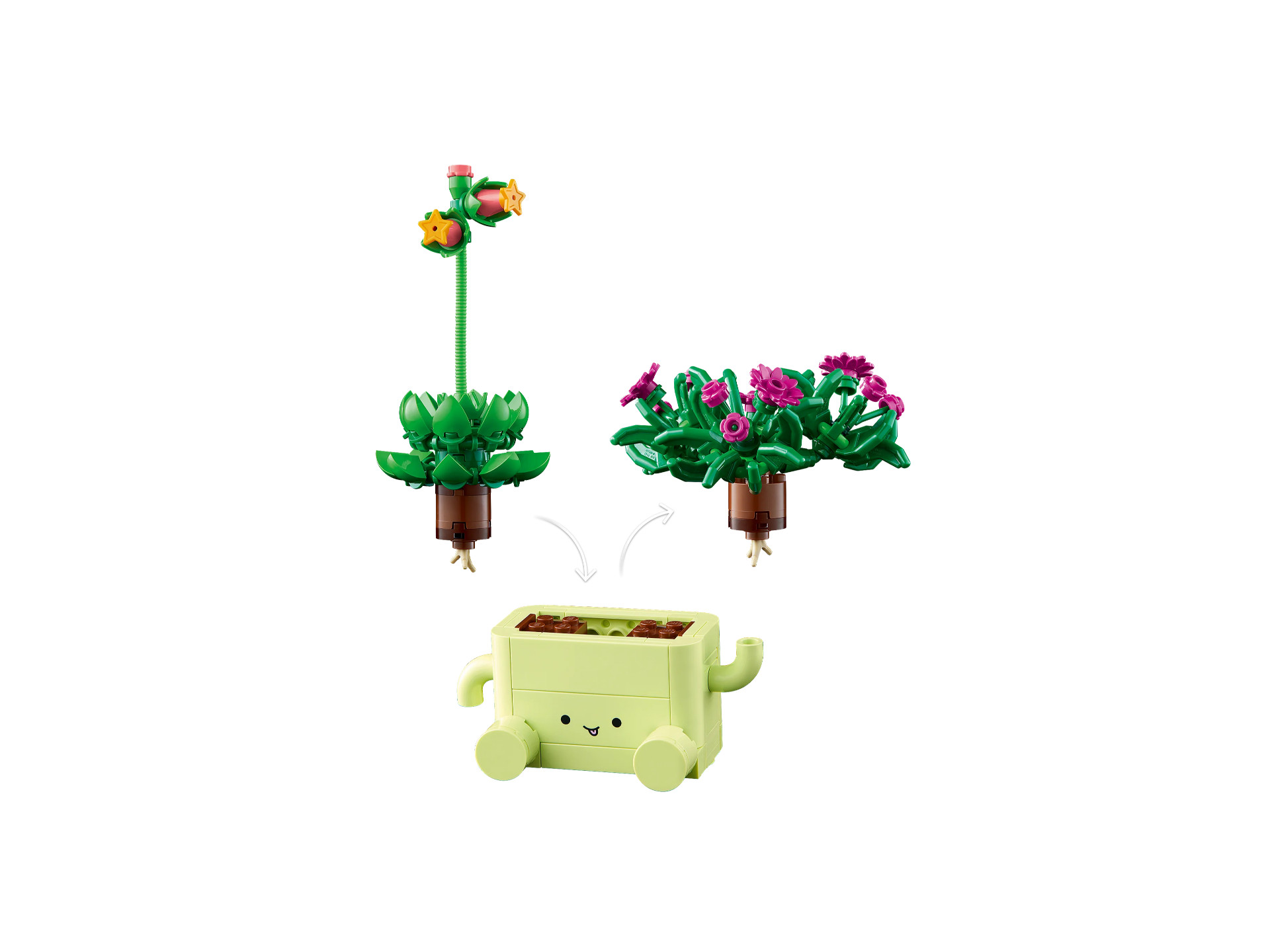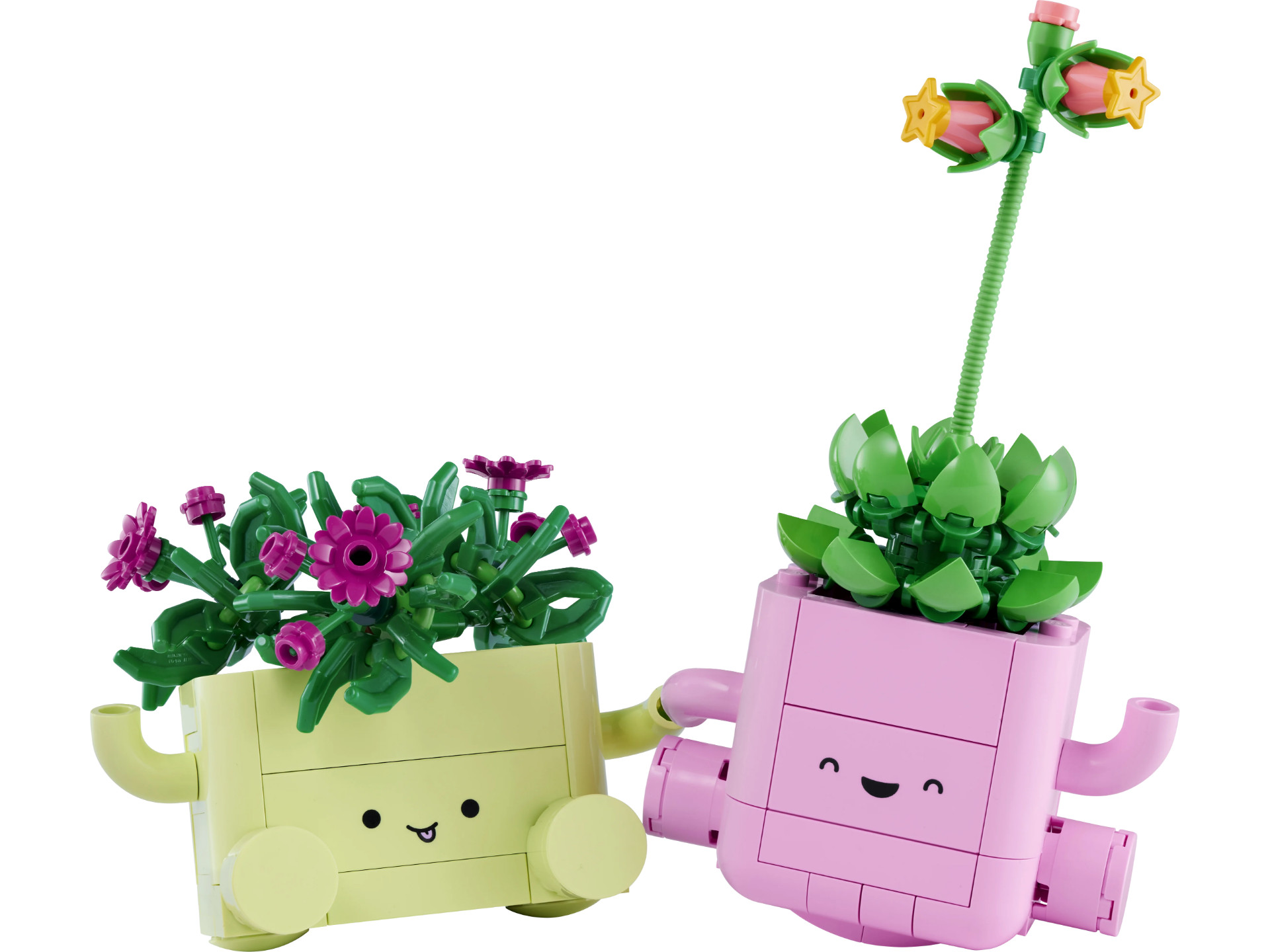 • 2 LEGO PLANTJES – bouw een delosperma (ijsbloem) genaamd Lumi met paarse knoppen en een echeveria genaamd Ellie met een lange stengel en koraalrode knoppen, plus 2 plantenpotten met armen, benen en smileygezichtjes