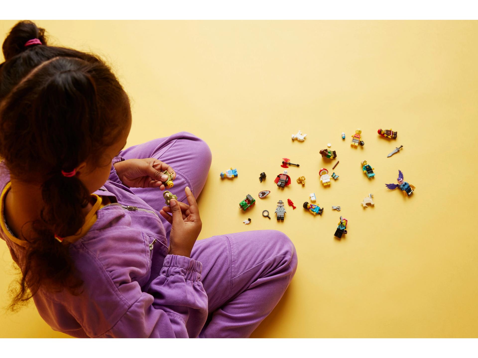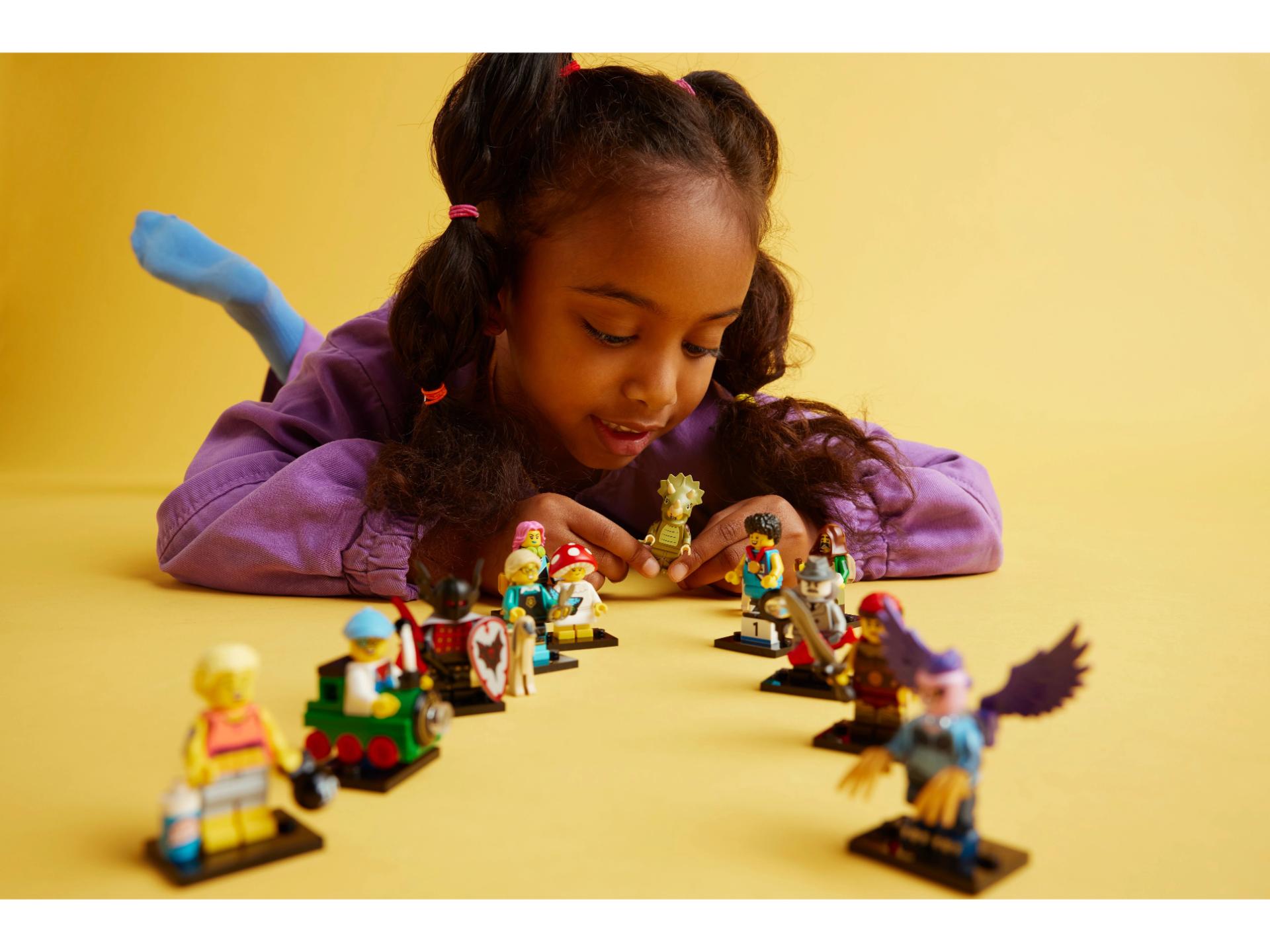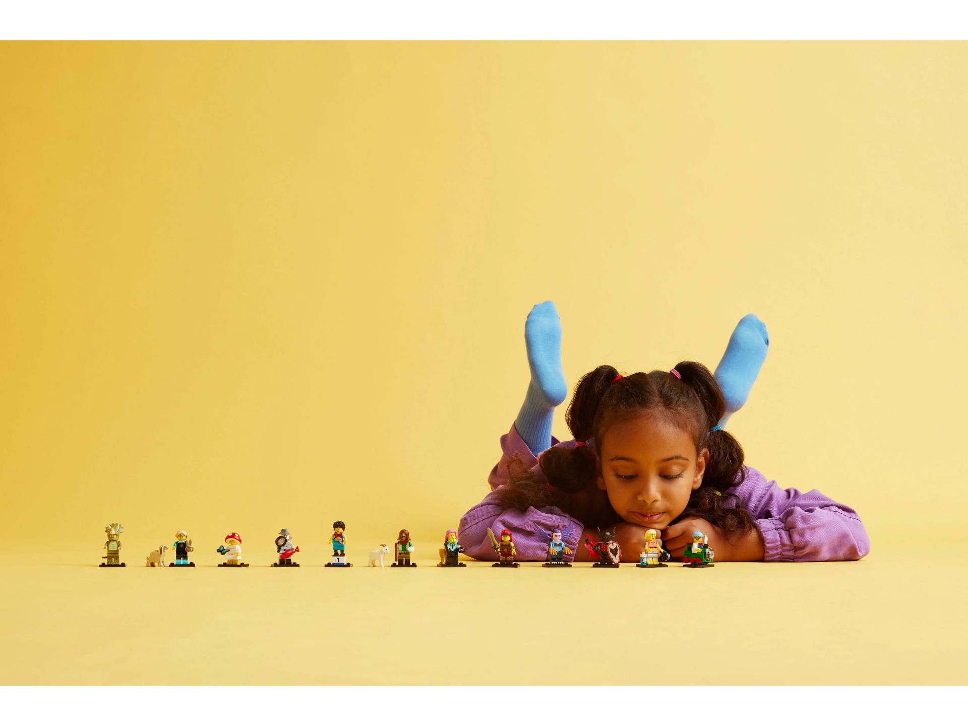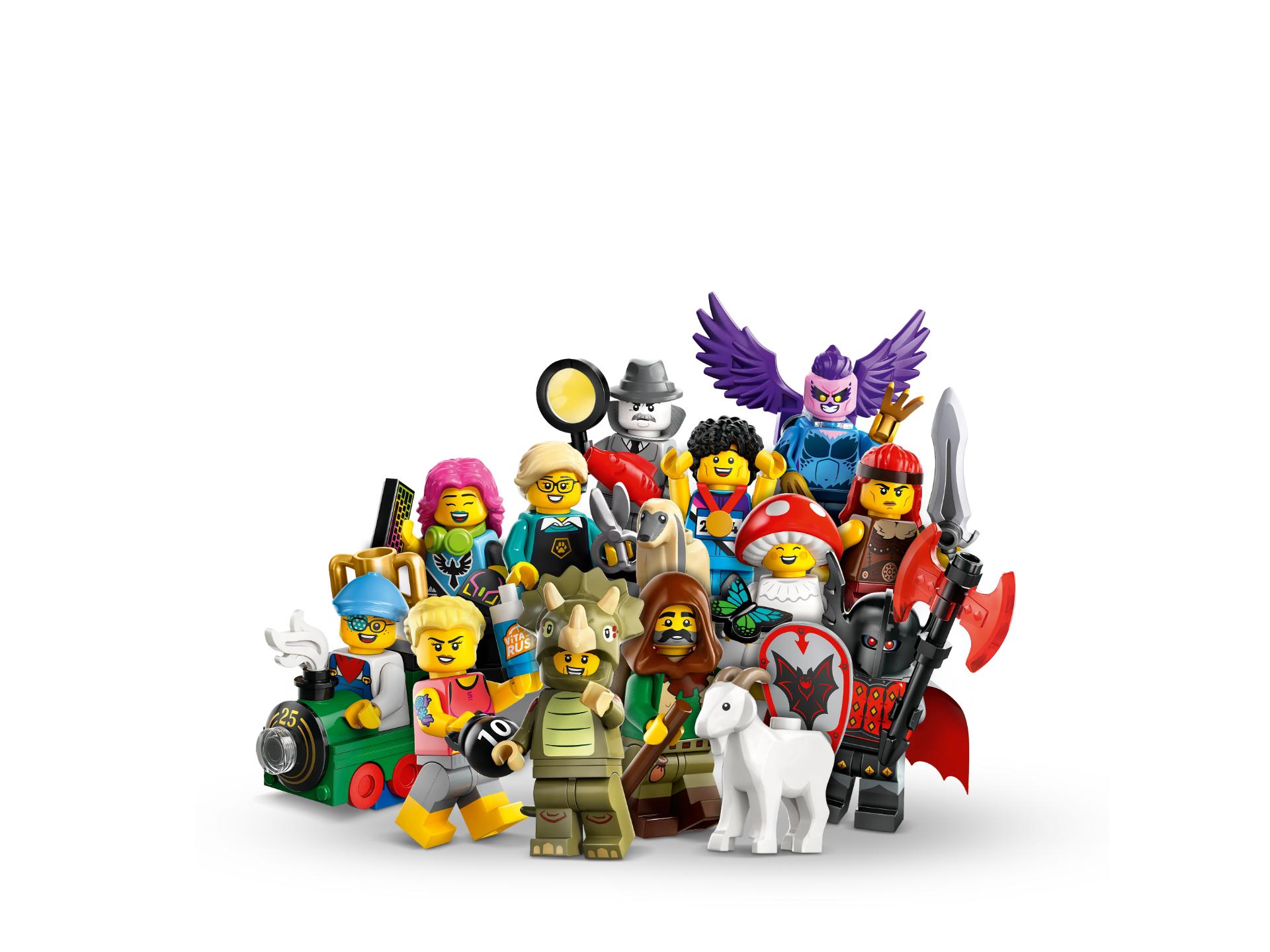 Er zit 1 verrassende LEGO minifiguur in elk doosje en er zijn in totaal 12 personages om te verzamelen: een fan in triceratopspak, sprinter, klassieke filmdetective, treinkind, geitenherder, vampierridder, hondentrimster, fitnessinstructrice, e-sport gamer, paddenstoelwezen, woeste barbaar en harpij.